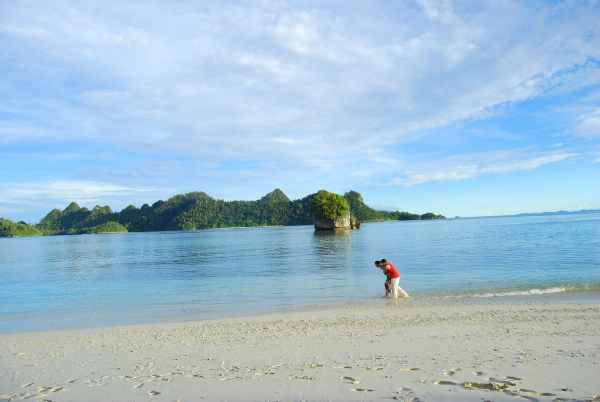 Inilah kecantikan Raja Ampat yang mulai termasyhur itu. Terdiri dari 1500 pulau dan atoll, serta empat pulau besar, Raja Ampat menyimpan terumbu karang terlengkap di dunia. Belum lagi perairannya. Dengan air sebening kaca, dari tebing dengan ketinggian 100 meter, ikan-ikan di bawahnya pun bisa terlihat jelas.